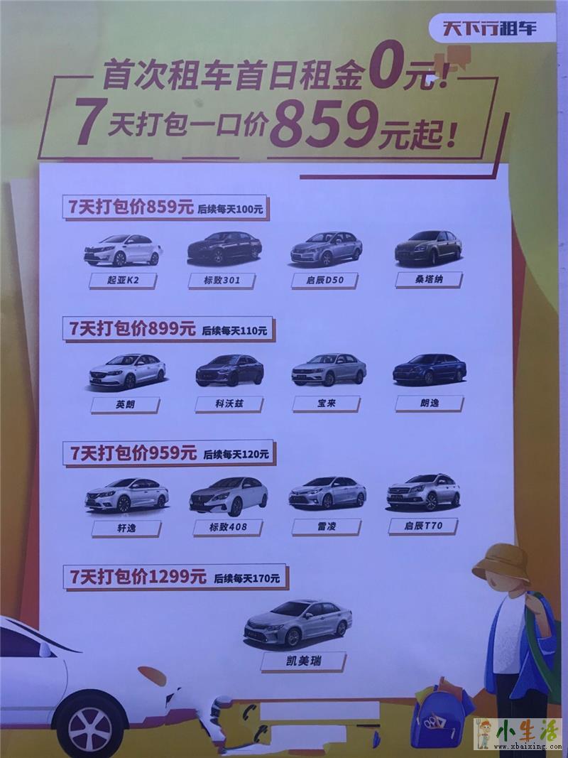 天下行新客户首日0元,租三免一,7天打包价包含租金、基本保险、不计免赔等,租车一周只要859元起。...